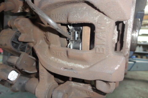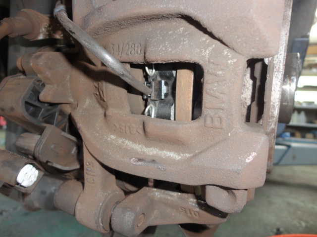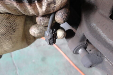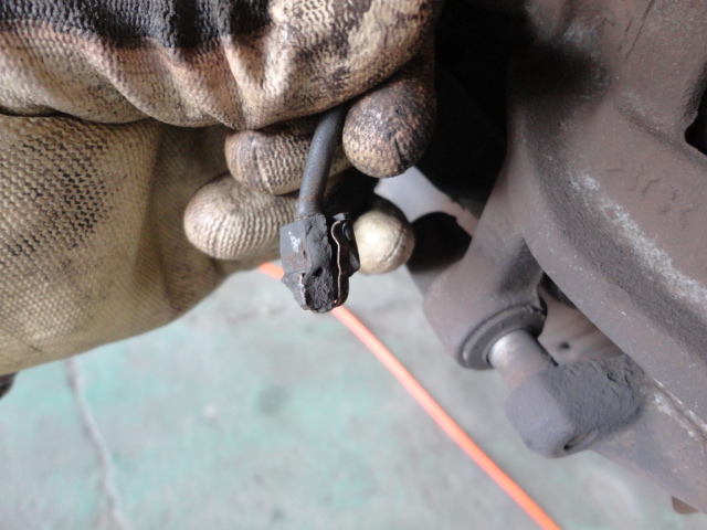 リフトに上げてセンサーを見てみるとブレーキパットが少なくなっていてセンサーの金具が切れています。